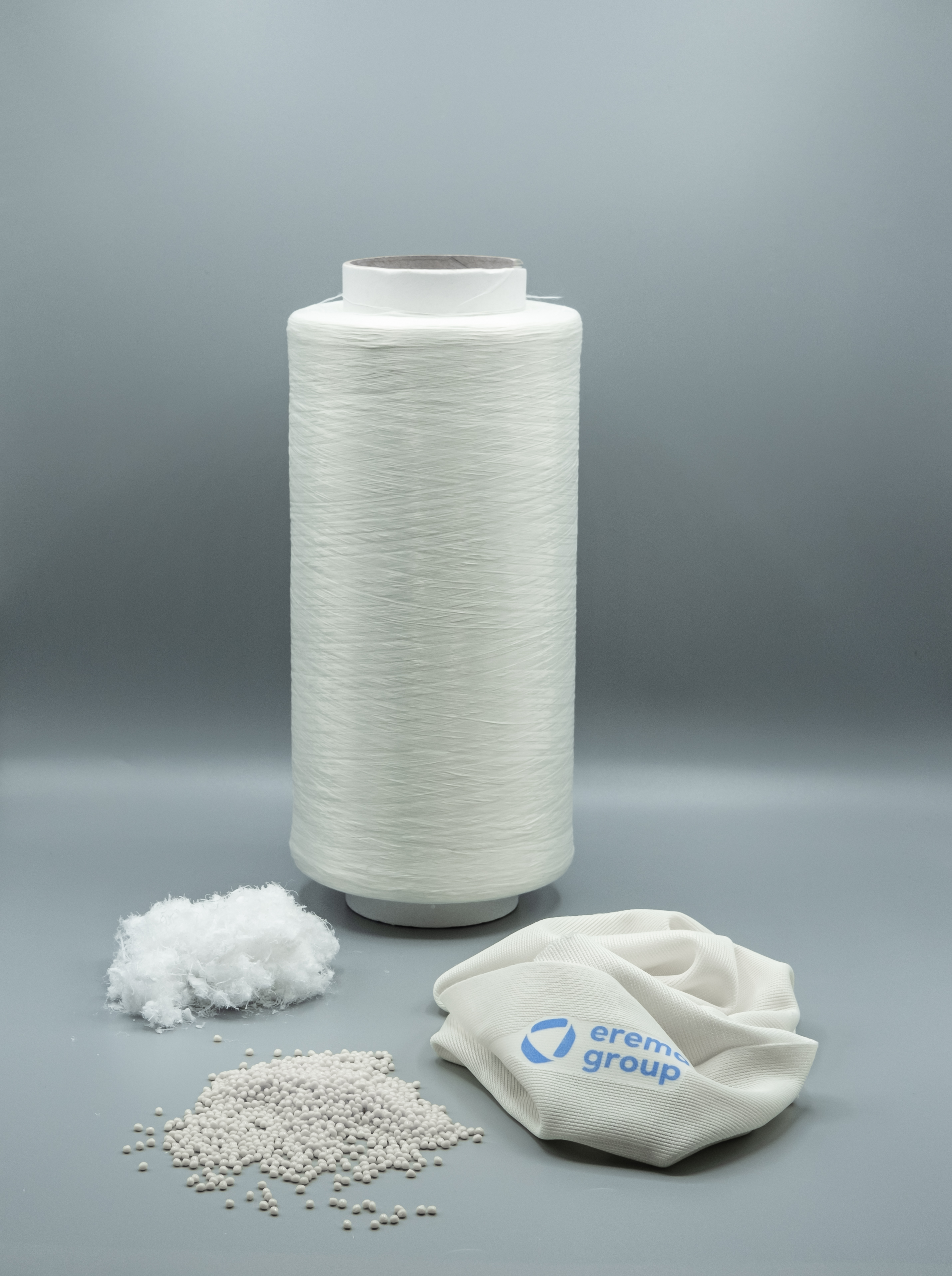 Fibre waste from filament fibre production was recycled into high-quality pellets in EREMA´s fibre test centre. Using filament technology, a 3 dtex fibre was spun, which was processed into knitted fabric for clothing or technical textiles. (photo: EREMA)